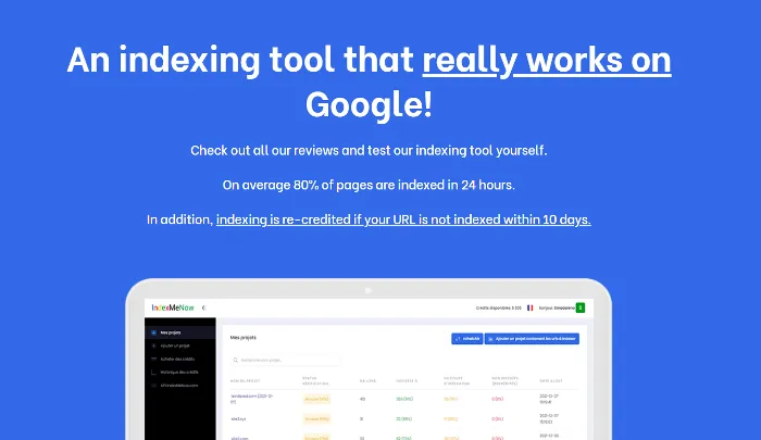 IndexMeNow indexes 80% of your URLs within 24 hours and indexes 100% of your URLs within 10 days. The uniqueness of our service is that it also offers an advantage known as "100% recredited". After 10 days, if your URL has not been indexed, it is automatically recreated with the number of credits available.
